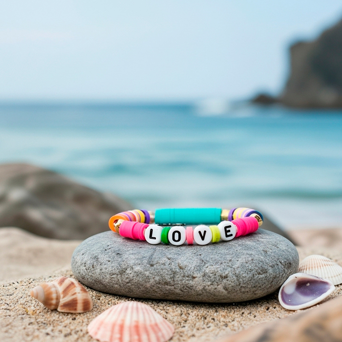 Pulsera elaborada en nylon resistente, fimo colores, letras y acero