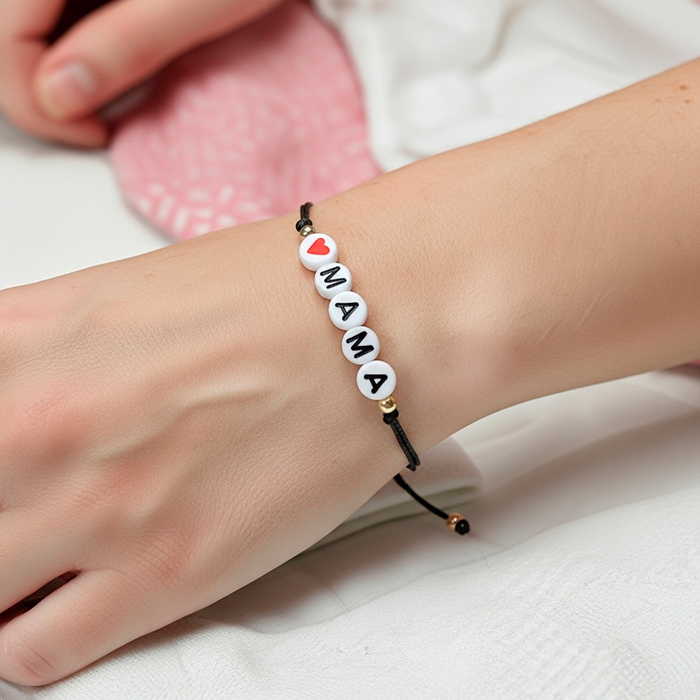 Pulsera elaborada en hilo, letras acrílicas y balines de acero